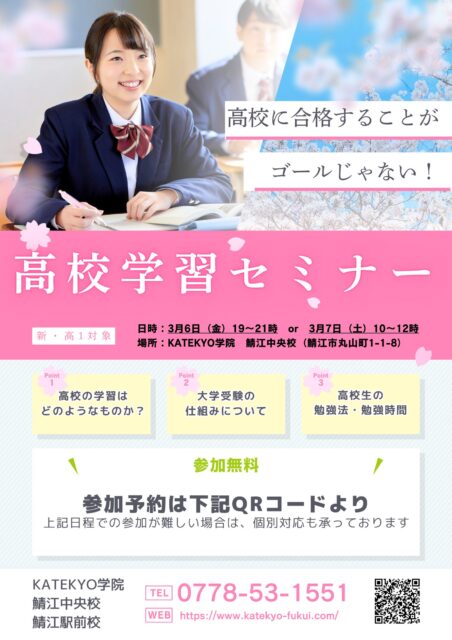 皆さんが積み上げてきた努力を、高校生活でも最大限に輝かせてほしい。そんな想いを込めて、新高1生向けの**「高校学習セミナー」**を開催します!